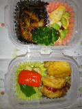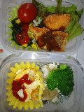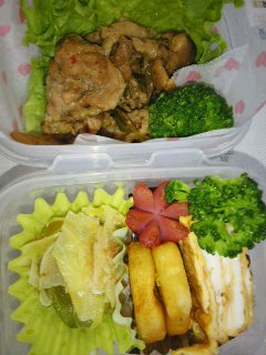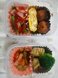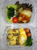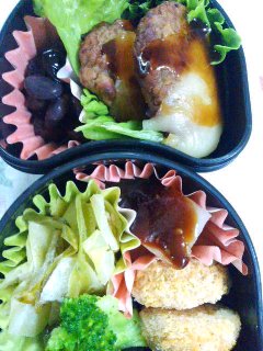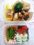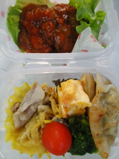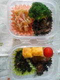 今朝のパパはからだのあちこちが痛いようで、しんどうそうだった。そりゃそうだよね。うしゅけは今日から中間考査。ちゃんと勉強したのかなぁ・・・・というわけで、今週はお弁当が少ない週。今日は二つ。いつものみしゃお弁当。グリーンリーフ。煮込みハンバーグ風。またまた「風」付き。ハンバーグを、レトルトのミートソースと一緒にチンしただけ。キャベツと厚揚げ、豚肉の炒め物。我が家の夕食定番メニュー。冷凍保存していたものをそのまま。それにしても、キャベツって「緑のおかず」にならないね。アミエビ入り卵焼き。ぎょうざ。前回は揚げたけど、今日は焼いた。ブロッコリー。プチトマト。いつものことだけど、ゴチャゴチャしてる。なかなか上手にならないな
