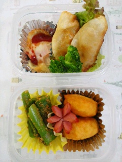 昨日の夕方、お米がなくなった夕食分はあるのだが、今日のお弁当分がない。普段、お米はコープで買っている。うちのコープの配達曜日は木曜日。つまり今日なのだが、早朝にくるわけもなく・・・うしゅけとみしゃおを食べさせて、塾に送り出してから、そしゅけと一緒に近くのスーパーに買いに行った。あと2合あったら間に合ったのにな~今日のみしゃお弁当。写真を大きくしてみたのだけど・・・・アラが見えるわね揚げ餃子。市販の餃子を揚げた。サニーレタス。ブロッコリー。しいたけのグラタン。しいたけのカサをひっくり返してアルミカップに入れ、ハム、チーズ、ケチャップをのせてオーブントースターで焼く。しいたけをそのまま入れたら食べにくいとクレームが入ったので、3つくらいに切って入れている。アスパラのピーナッツ和え。キューピーのピーナッツ和えの素使用。チーズ入りチキンナゲット。みしゃおの大好物。うしゅけの好物。そしゅけの苦手。タコさんウインナー。アラポンさんのお弁当を真似て、頭ではなく足の部分を上にして入れた。ちょっとは華やかになったかな?