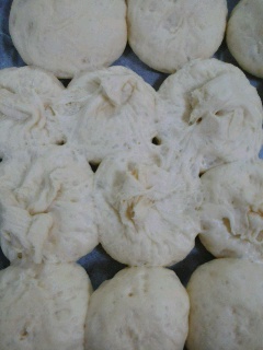 今日の夕食はクリームシチュー。ここは張り切ってパンを焼かねば!!一番基本のちぎりパン。生地をこねるのはホームベーカリーにお任せして、濡らしてギュッとしぼった布巾をかけて車の中で2次発酵。布巾の端をぴらっとめくると、ほどよく膨らんでいい感じだ。よしっと布巾を取っ払おうとしたら・・・・・生地と布がくっついてるってばひっぺがすように布巾をとったらこの写真の通り。やられたよ~。こんなの初めてだわ~どうなんだろ?打ち粉してればよかったのかな????この哀しい写真を見て~しかしめげてなどいられない。そのままオーブンにつっ込んで焼き上げた。う~ん・・・つぶれちゃった分はちょっとかためだったよ・・・