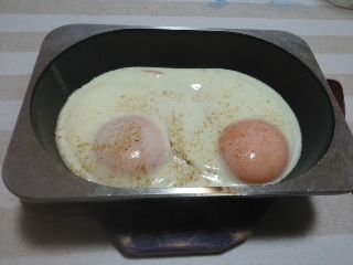 みしゃおが目玉焼きを食べたいというので、前々からやってみたいと思っていた方法で作ってみた。魚焼きグリルで焼いてみた。白身に隠れて見えないけれど、ハムが2枚敷いてある。黄身のかたまり具合がどうなるんだろうと不安だったが、とろっとろっ、とってもいい感じの半熟だったよ。