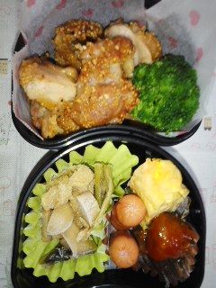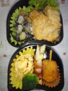 なんかこう、お目目ウルウル、お鼻じゅるじゅるで、ほっぺのあたり殴られたみたいに痛い。頭も痛い。熱があるとわかったら余計にしんどいので、はからなかったが、まあ、あっただろうな~。薬飲んで乗り切ったよ。気温がさがってきて、この時期順番に風邪引かれてたいややわ~と思っていたら、私が一番重症だった・・・・みしゃお、うしゅけ、私と順番に風邪引いて、今はそしゅけ。くしゃみと鼻のせいでお目目うるませながら学校に行ってる。ちなみに今日はプールの日だけど、帰って来たときの様子次第だな。さて、先週は火曜日からうしゅけが中間考査、木曜日からみしゃおが中間考査だったので、木曜日、金曜日とお弁当なしだった。今日からまたふたつに戻った。今日のみしゃお弁当。ひじきの煮物。冷凍保存していたのをそのまま。鶏むね肉の味噌マヨ炒め。冷凍保存していたのをレンジで解凍。グリーンリーフ。アミエビ入り炒り卵。ポテトとチーズのベーコン巻き。うずら&ウインナー串。冷凍食品。ブロコッリー。相変わらずの手間なし弁当だね。