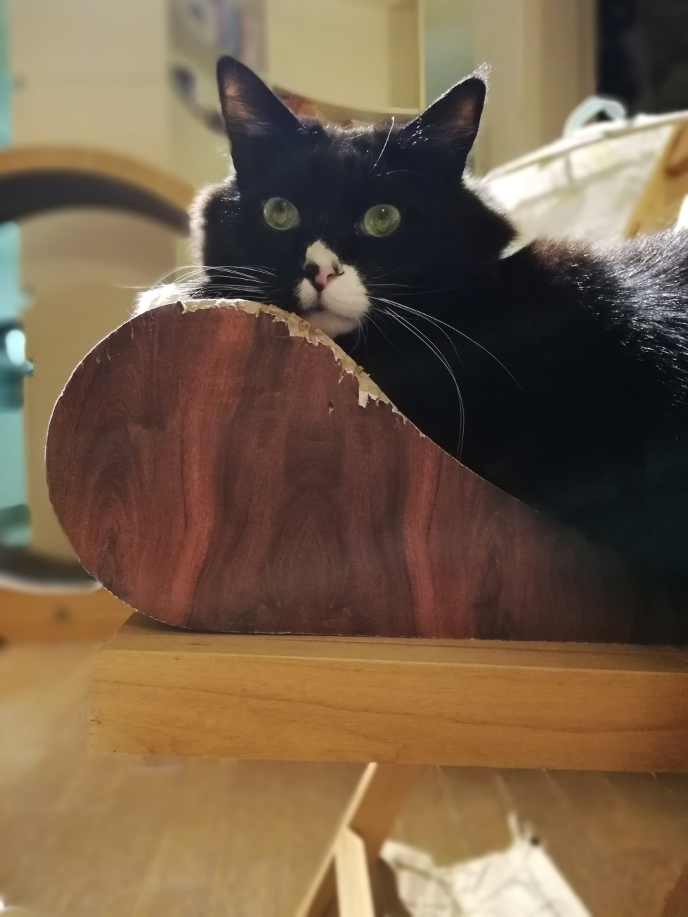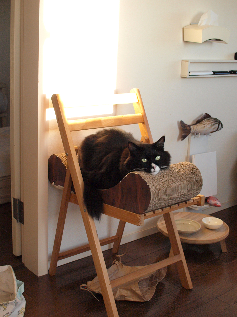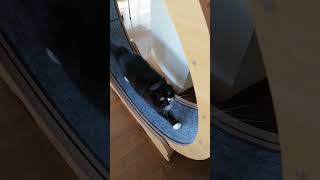 # 3230 (3/17)すっかりイスの上が定位置になった爪とぎソファー。向きもイスの間に入れて縦に置いたらくーちゃんが勢いよく飛び降りてもソファーが蹴っ飛ばされて落ちることがなくてよい。くーちゃんのとこには日が当たってないな。もうちょっと下までこないかな。ひなたぼっこできそうでできない惜しい位置。くーちゃんは自分が動くのはめんどくさいので見ないことにしてさっさとあきらめる。別にいま寒くないし。このイスとソファーがあったところにキャットホイールを置いたのでイスとソファーは場所が変わってここに来た。どーんと置いたキャットホイール。大きいけど空洞なのでそんなに圧迫感はない。カーブする食器棚と相まって曲線のインテリアとして調和している感じ。素敵なオブジェ。ホイールにソファーにくーちゃんのテーブル、そして散らばる遊び道具。くーちゃんのものばっかりだ。全部ナチュラルな木の色で統一感。偶然だけど。 * * *しばらくしてくつろぎタイムが終わったら、さあー、また特訓なのだ。これは3日目の夕方。前回の、手だけで少し回したちょっとあと。肉球ビームで誘ってみる。これ、大好きなので反応よく始まった。けど、ホイールに触るとなるとそれはちょっと冷静に構えてしまうくーちゃん。調子が出てきて、ビームつかまえたさにやっと自らホイールに乗ったくーちゃん。でも動くと揺れちゃう。これがまだ慣れなくて、体を伏せてホイールの動きを封じるくーちゃん。動かない。くーちゃんは立たないのだ。こうしてると地面がゆらゆらしないのだ。ゆらゆらしなければ別にどうということはない。ビームが近くにくるまでこうやって見張るのだ。来た。腹ばいのままビームに手を出すくーちゃん。いっしょけんめチラチラやってたけどちーとも乗ってこないくーちゃん。そのうち二人とも飽きてきて揺らすのもいい加減、眺めるくーちゃんもよそ見しながら。ホイールに誘うのは一旦あきらめて、普段のように壁で遊ぶことにした。これ、一番やる気出る。どっすんどっすん飛ぶくーちゃん。 * * *夜になってふと、乗ってみたくーちゃん。くーちゃんの中でホイールの存在が認められつつある。やっと、歩いた!まるがホイールの外で手をチラチラさせたらそれを狙って立つ、そしたらホイールがぐるんと動いて勝手に歩いちゃう。これはいい作戦だった。3日目、ようやく成功。= = = = = = = = = =さてー、2年前の2歳くーちゃん。おかえり890日目。 → おててだいじ寝 手をぎゅっとして寝るくーちゃん。2023年4月2日の写真。= = = = = = = = = =おっきいくーちゃん。今日は、2019年。2019年4月2日の写真。毛布にもぐっているくつした。真ん中の黒いやつ、しっぽ。なぜかキラキラ加工の写真。ちょろんと出ているしっぽ。レンジの上で微妙な顔のくつした。- - - - - - - - - -ランキングサイト参加中 LINEスタンプ Tシャツとか 買ったものと欲しいもの