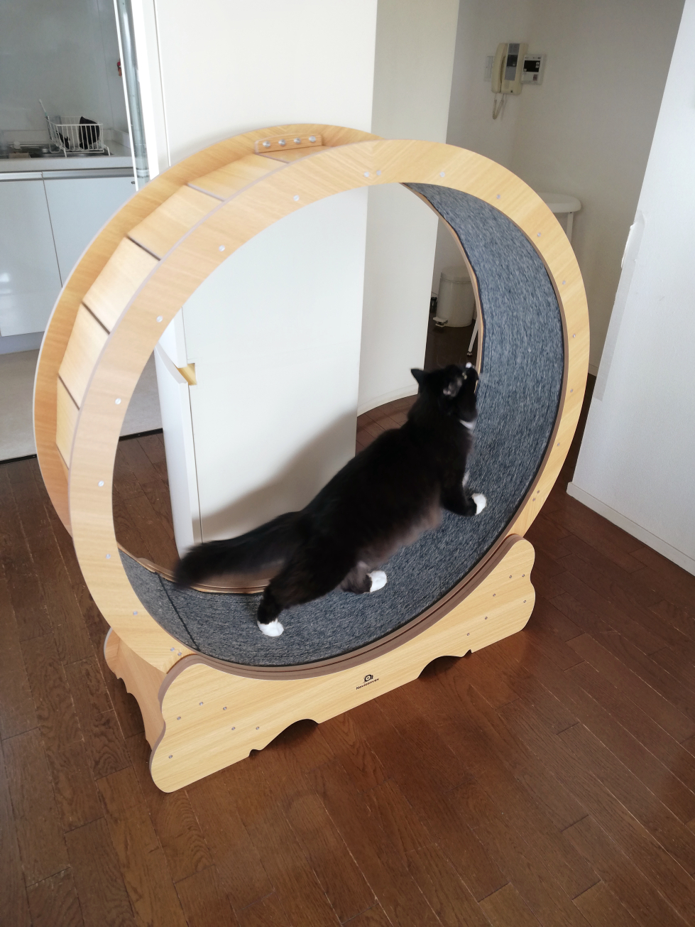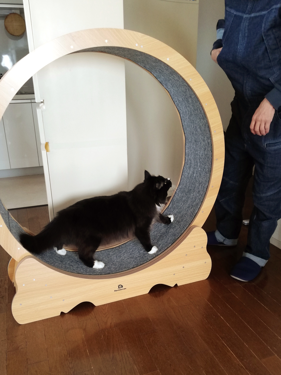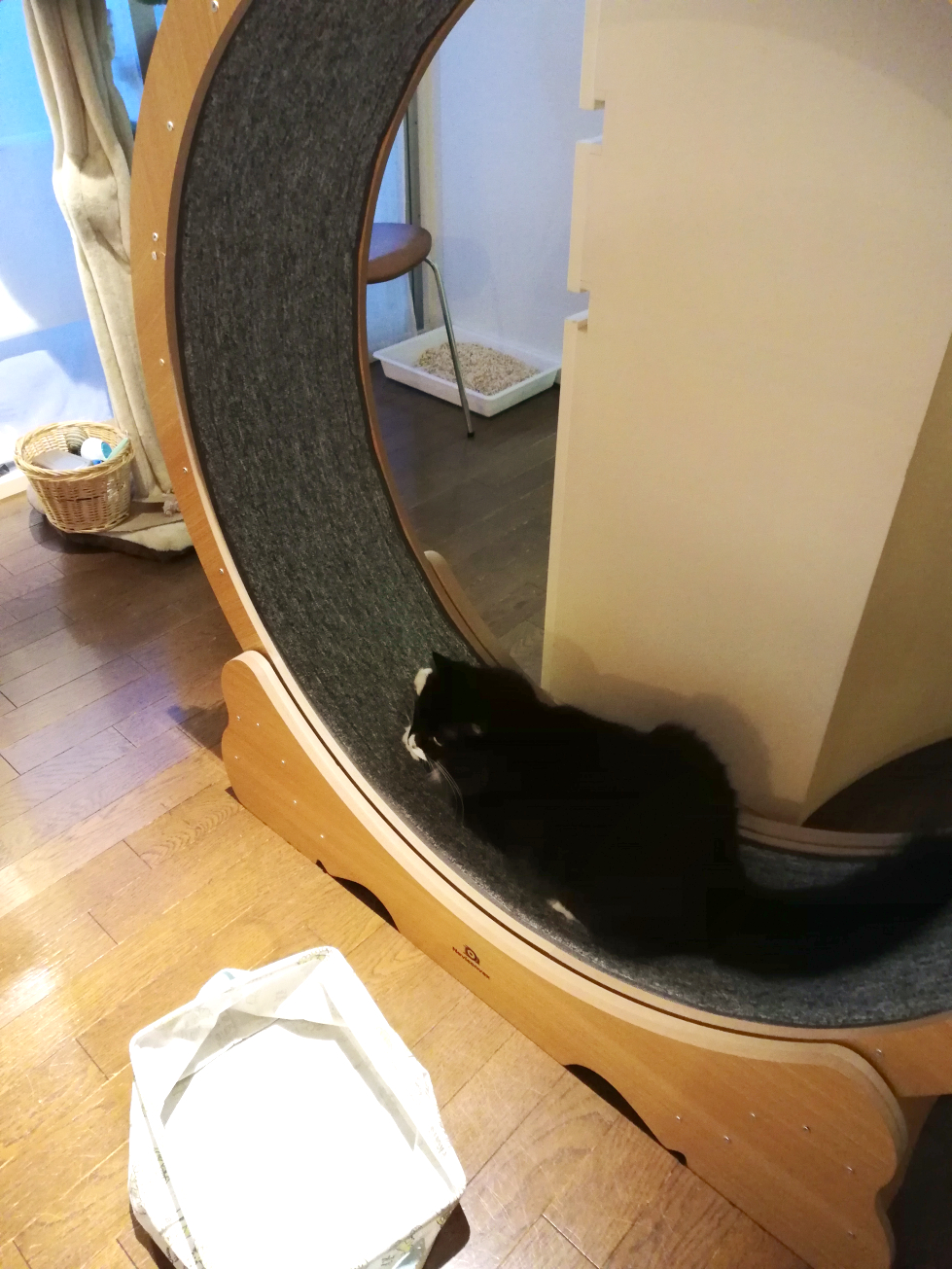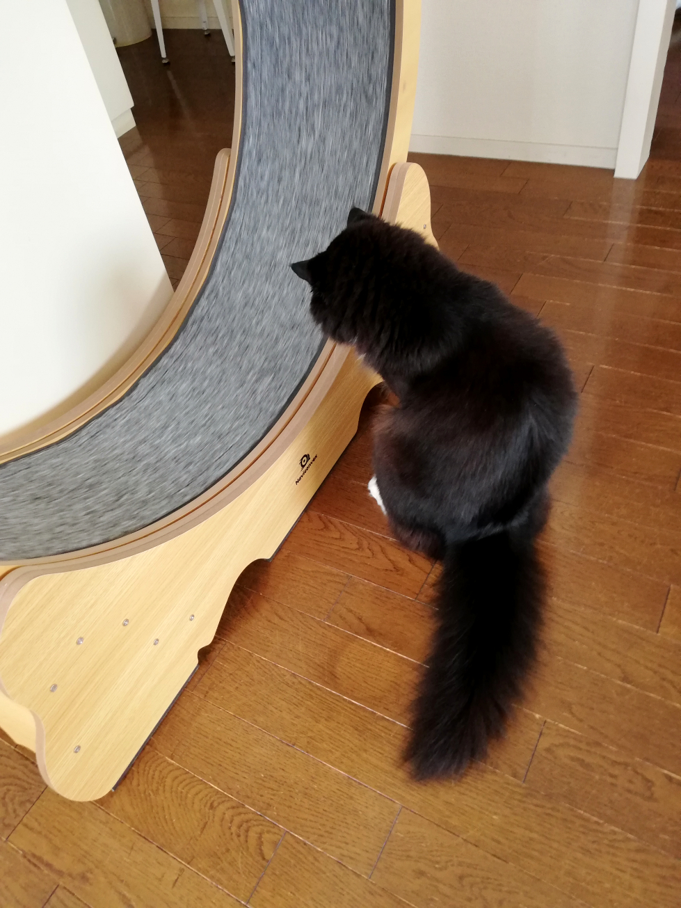 # 3235 (3/21)昼すぎのくーちゃん。ホイールを回している。設置から7日、すっかり気に入ってふと思い立つとちょこちょこウォーキングかランニングしている。軽くならす程度に少し歩いて納得するくーちゃん。こんな感じでちょっと乗って何回か回してすぐ降りる。というのをしょっちゅうやっている。夕方、ホイールに日が当たっている。回すと壁に反射してチラチラ連続で現れる。それが気になって見に行ったくーちゃん。そしてまた乗った。回さないけど座っていることもよくある。イスとしても使い始めたし、たまにはなめなめ場にもなっている。とにかくこれが気に入ってそして気になってつい乗ってしまう。そして乗っているとやっぱり回したくなる。軽くウォーキング。急がず一歩ずつ歩いてみる。一旦、休憩。またやる気スイッチが入って今度は小走りで回してみる。やっぱり壁の反射が気になって、見るために立ち止まっちゃうくーちゃん。見に行く。近くへ行ったらもうキラキラは止まっているのだけど。また戻ってきた。充電ステーション。どんな表情やねん。いろいろ考えている。しばらく熟考。休むことにした。じわじわ疲れてきた。一日、何度もよく歩いた。まだこのあと、晩ごはん食べたらまた回して、おかわり食べたらまた回して、寝る前も激しく回して。もう寝ようと布団に入ったのにホイールのゴロゴロ音が響いてきて、静音設計で、普段はうるさくないんだけど夜中、静かだとやっぱり気になるのでストッパーで止めさせていただいた。ちゃんと回転が止められるストッパーもついているのだ。お便利。= = = = = = = = = =さてー、2年前の2歳くーちゃん。おかえり896日目。 → 箱の白玉まくら ふちにかけた手を枕にするくーちゃん。 → 何となく箱入りな夜 ちょっと入ってみたくーちゃん。2023年4月8日の写真。= = = = = = = = = =おっきいくーちゃん。今日は、2009年。2009年4月8日の写真。 → 牛すじ豚タンごはん 【猫ごはん】 くつしたの晩ごはん。中身は、 牛すじ、豚タン、くるみ、レトルトフード。大人は、牛すじ煮込みうどん、豚タンとねぎのすき焼き風、こんにゃくのきんぴら、いかとじゃがいもの煮物など。 おいしいとこ探って食べるくつした。うみゃーいの顔のくつした。よく噛んでいるくつした。- - - - - - - - - -ランキングサイト参加中 LINEスタンプ Tシャツとか 買ったものと欲しいもの