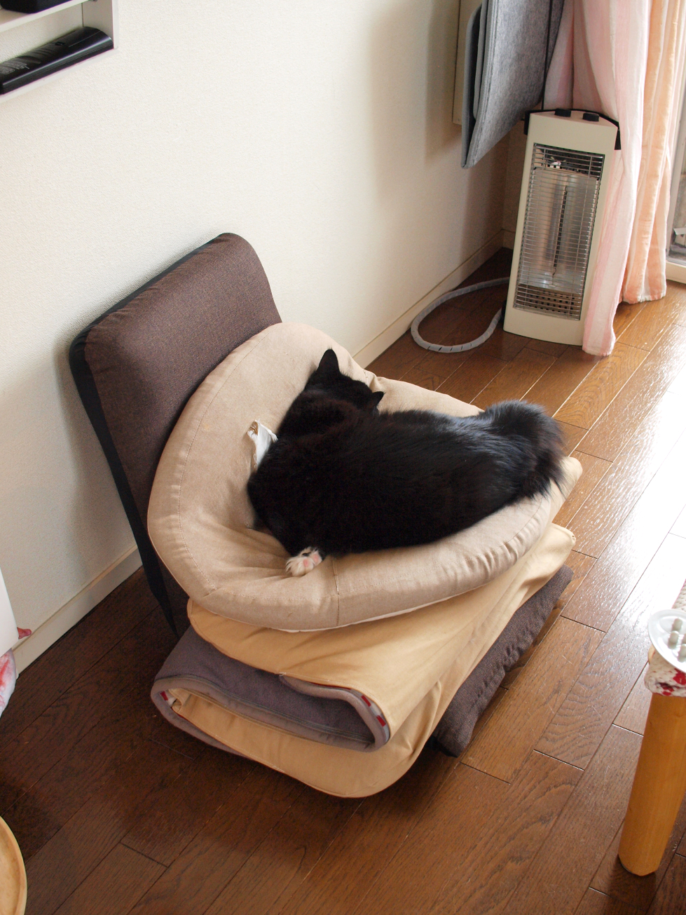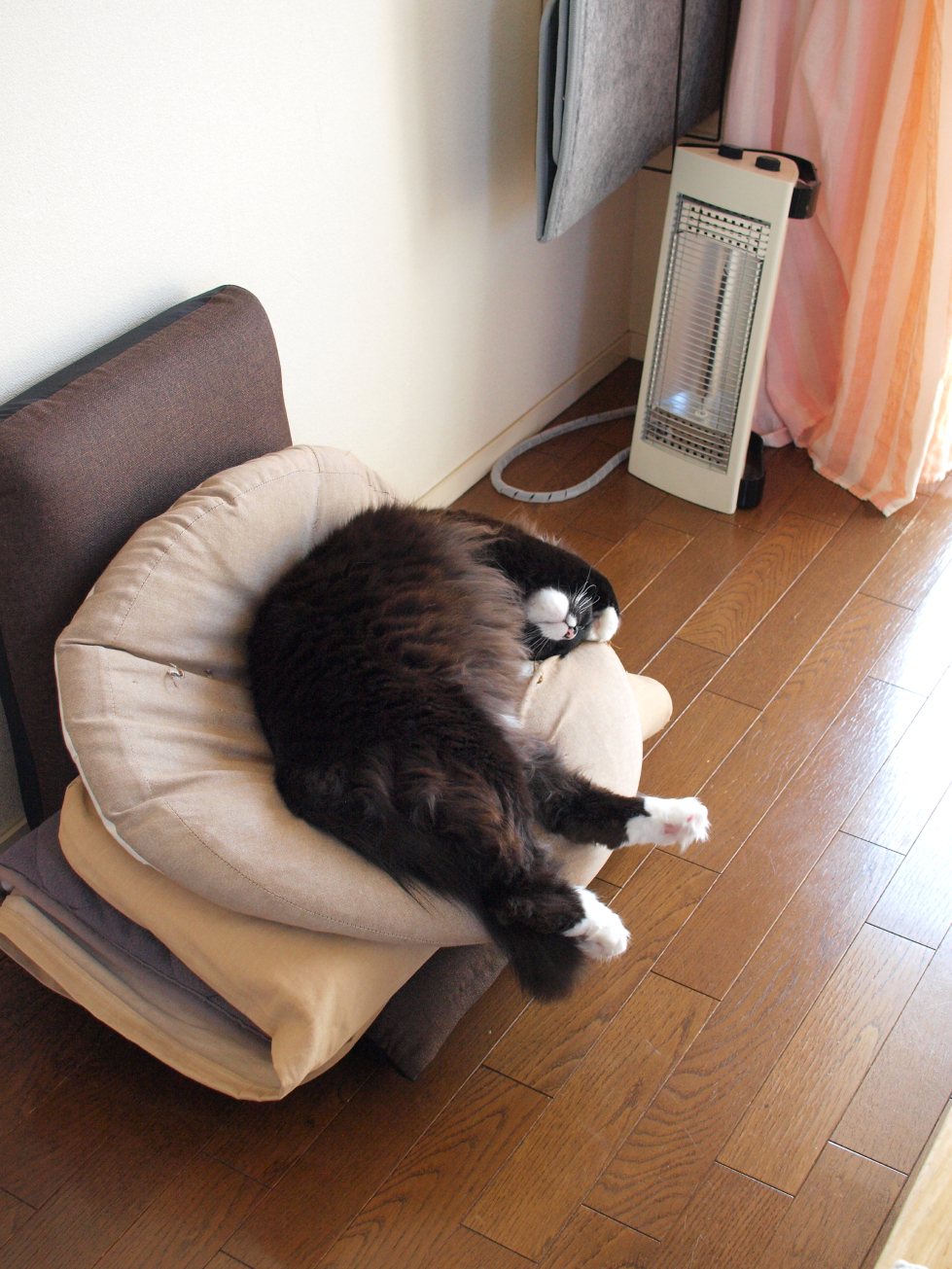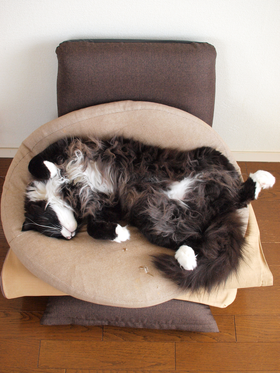 # 3248 (4/2)あったかくなって季節の花が開く4月の初め、くーちゃんの寝姿も開きつつあった。またおっぴろげ寝のシーズンだ。座椅子に積んだクッションによる包まれ具合がちょうどいい感じ。とーーっても気持ちよさそうに寝ている。頭はクッションにどっちん。うすーーく目が開いて白目で寝ている。熟睡。近づいても起きなかった。さて、困ったことにくーちゃんはホイールに乗らなくなった。数日 乗ってない。きっかけは毛玉を吐いたこと。毎日なめなめするからおなかに毛がたまってそれを定期的にゲボッと吐くのだけど吐く時は本人も予期せず急にもよおすから場所を選べない。居合わせたときは広い何もないところに誘導するのだけど(冷蔵庫の上なんかで吐きそうになると大急ぎで抱き下ろす)今回はタイミング悪くひとりのときにホイールの上で吐いちゃったらしい。ほんとはホイールの向こうの隙間に吐こうと思ったみたいなのだけど、間に合わず完全にホイールのカーペットの上。重曹とクエン酸できれいに拭いてにおいも取ったつもりだけどくーちゃん的にはまだ気になるらしくそれからホイールに乗らなくなってしまった。それでまた最初みたいに肉球ビームで誘ってみる。遊びはするけどホイールには乗らないんだな。ビームで遊んでいてもホイールの上ばかりだと「そこはもういい」と飽きてしまうので、誘導作戦は中断してくーちゃんの好きな壁遊びに切り替える。やっぱり壁でやるのが一番たのしい。高いところめがけてどっすんドッスン飛ぶのが好き。まぁ、そのうちにおいが消えればまた乗るようになるよとは思うのだけど、えー、このまま乗らなくなったらどうしよう〜なんて考えも浮かんできちゃって無駄に焦るのだった。= = = = = = = = = =さてー、今日も写真ないので2年前の2歳くーちゃん、おかえり910日目は お休み。代わりにこれでも見ててー。4年前のくーちゃん。 → くーちゃんも見たい。 → なぞのもしゃもしゃ = = = = = = = = = =おっきいくーちゃん。今日は、2018年。2018年4月22日の写真。うとうとしているくつした。目玉焼きクッションで寝るくつした。すやすやぐっすりくつした。- - - - - - - - - -ランキングサイト参加中 LINEスタンプ Tシャツとか 買ったものと欲しいもの