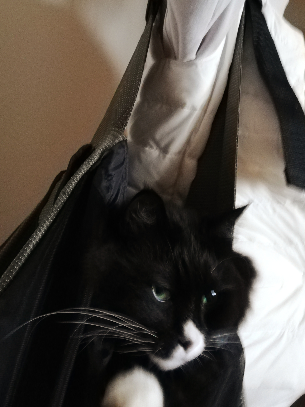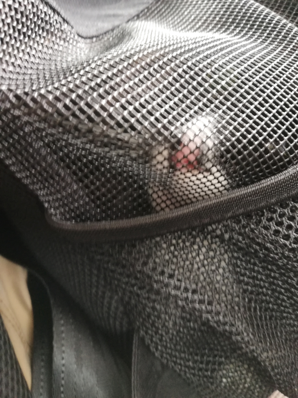 # 3238 (3/24)くーちゃんが退屈そうにしていた。ホイール回したら?「もういっぱいやった」お散歩でも行く?「おさんぽ?」ヒモ見せたらポカンとしてたのでサササッと着せた。大人しく着せられた。久しぶりなので「おさんぽ」がピンとこなかったよう。リュック持ってきてシュポっと入れた。「あっ、これか!?」「お外はいやーー!」と、拒否感あらわにリュックから出ようともがもが、もがく。わかったわかった。そんなにイヤなら今日はおでかけの練習。そういえばお正月から一歩も外へ出てなかったな。寒くなくなったしまた散歩だとかドライブだとかお出かけしないとね。そんなわけで家の中をリュックでぶらぶらお散歩。これは案外いやじゃない。抱っこでうろうろするのとはまた違って、リュックから見る部屋の景色はちょっと新鮮な感じ。あっちこっちキョロキョロ。リュックで暴れたときガブッとやられた。「イヤだー!」と怒りながらだった割には加減して噛んでいた。思いっきりじゃなかった。だからこの程度。流血してない。リュックから出て解放感を味わいつつ外へは行かずに済んだとほっとしてなめなめ。ヒモはまだ着てるけどリュックの中でくちゃくちゃになった毛を整える。ときどき、チラっ。また連れ出されそうにならないか、警戒。足もきれいにしてひととおり済んだ。「そうだ。」と、ふと思い出す。連れ出されそうになったときはあそこに入るんだった。今さら戸棚の下のくーちゃんの個室に入る。むぎゅっとなりながら「おさんぽ、いきません」のアピール。いや、だからもう行かないって。ホントかいなと部屋にこもって身動きせず。箱に入ってみたらまた連れ出される時の気分になった。リュック片付けたりうろうろしてたら「あ、もういいのか」と、拍子抜けの顔。じゃあ入ってる意味ないかとも思ったけど、久しぶりに入った箱の中、これがまた居心地よかった。この感じ、思い出した。なんか楽しくなってしばらく出てこなかったくーちゃん。= = = = = = = = = =さてー、2年前の2歳くーちゃん。おかえり899日目。 → ドアの間から狙う ドア裏に入って遊ぶくーちゃん。入っていくくーちゃん。飛びつくくーちゃん。 → 掃除機で吸われる。 じゃれつくくーちゃん。 → ほぼすっぽりもぐり シーツもぐりくーちゃん。2023年4月11日の写真と動画。= = = = = = = = = =おっきいくーちゃん。今日は、2009年。2009年4月11日の写真。 → トマトとレタスのサラダごはん 【猫ごはん】 くつしたの晩ごはん。中身は、トマト、レタス、煮干し、卵黄、レトルトフード。大人は、土鍋カレー、卵トマト炒め、レタスとトマトのサラダなど。お皿の外でもぐもぐくつした。煮干しを探して食べるくつした。- - - - - - - - - -ランキングサイト参加中 LINEスタンプ Tシャツとか 買ったものと欲しいもの