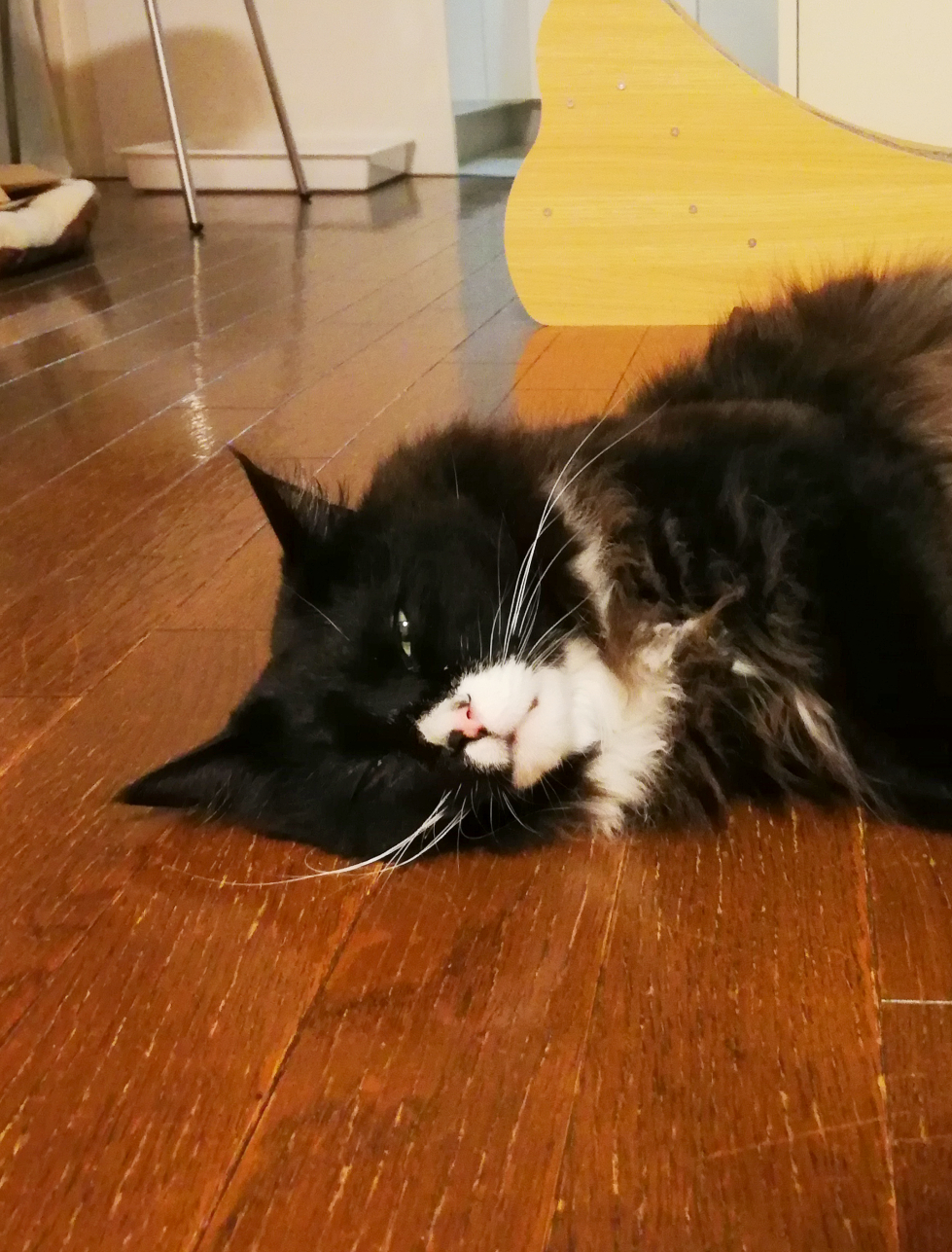 # 3233 (3/19)朝5時、起きたとこのくーちゃん。大人たちが起きてくーちゃんも目を覚ましたけど体はまだ寝ていた体勢のまま。くーちゃんはこの数ヶ月ずっと爪とぎソファーで寝ている。ホイールが来てソファーの場所が変わったけど、相変わらず夜はソファーで寝る。場所が変わってさらになでなでされやすい位置になった。大人たちがよく通る場所なのだ。だから目が覚めてもしばらくここにいる。もう少ししておなかが空いたら台所へ行く。午前中、自主練に励むくーちゃん。勢いをつけて速く走ってみる。なかなかうまく走れた。満足。夕方はさらに全速力に挑戦してみた。一旦、落ち着いてから「よし、」と意を決して走り始める。一気に加速して華麗にダッシュ。野性味あふれるかっこいい走りができた。短いけど思いっきり走った。ふー。くーちゃん、すごいね。速く走ったねー。ちょっと気持ちよかったかもな、くーちゃん。追いかけっことかであわててドタドタ走ったり、狩りごっこして身をかがめながらスタタタっと急いで走ることはあってもこんな風にのびのび手足をのばして思いっきり走ることってほとんどなかった。くーちゃんのネコ科動物としての高いポテンシャルを見た気がする。疲れたー。と、寝転ぶくーちゃん。超短距離走なので数秒と走らないけど一日のうちに何度か乗って走っていた。走る時間が短くてあっ、と思っても動画を撮り始める前に終わっちゃうからなかなか記録に残せないのだけど。もう、おもちゃやおやつで誘わなくても自分から進んでホイールに乗って走るようになった。楽しさに目覚めてしまったくーちゃん。楽しくっていい運動になって、見ている大人たちも楽しくて、これ最高やね。= = = = = = = = = =さてー、今日は写真ないので2年前の2歳くーちゃん、おかえり894日目は お休み。代わりにこれでも見ててー。3年前のくーちゃん。 → テレビは見ずにテレビの上 → おっ広げのおしょんべ砂 = = = = = = = = = =おっきいくーちゃん。今日は、2009年。2009年4月6日の写真。 → イカの刺身と豚しいたけもやし 【猫ごはん】 くつしたの晩ごはん。中身は、アオリイカ、豚肉、干し椎茸、もやし、長芋、レトルトフード。大人は、アオリイカの刺身、八宝菜、とろろうどんなど。回り込んで確認するくつした。横向きで食べ始めるくつした。- - - - - - - - - -ランキングサイト参加中 LINEスタンプ Tシャツとか 買ったものと欲しいもの