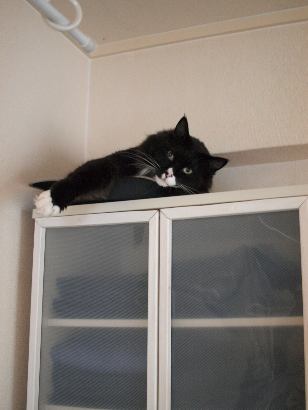 # 3240 (3/26)ピンポーンと、玄関チャイムが鳴るとくーちゃんは冷蔵庫の上へ急いで上がる。鼻を真っ赤にしてドキドキしながら玄関から聞こえる音に耳をそばだてる。前は寝室の棚の上に逃げていたけど実はちょっとだけ興味がわいてきて、どんな人が来てるかガラス戸のふちの1cm程の透明な部分に顔を近づけて冷蔵庫の上からこっそり見るのだ。だいたいは宅配便か郵便屋さんでほとんどドアの外でやり取りをして玄関の中へは入ってこないので姿は見られないのだけど、それはそれで知らない人がうちに入ってこないという安心が確認できてくーちゃんはホッとするのだった。= = = = = = = = = =さてー、今日も写真ないので2年前の2歳くーちゃん、おかえり901日目は お休み。代わりにこれでも見ててー。去年のくーちゃん。 → 下手くそだったときの「んにゃ!」(動画つき) = = = = = = = = = =おっきいくーちゃん。今日は、2008年。2008年4月13日の写真。 → わるくー。 まるの上に乗っているくつした。目がうつろなくつした。べったり貼り付いているくつした。まるの顔をじっと見るくつした。見るのやめたくつした。そのまま寝たくつした。昼間もおなかに乗ったくつした。満足気な顔のくつした。うとうとしているくつした。ずり落ちそうな足を支えられるくつした。- - - - - - - - - -ランキングサイト参加中 LINEスタンプ Tシャツとか 買ったものと欲しいもの