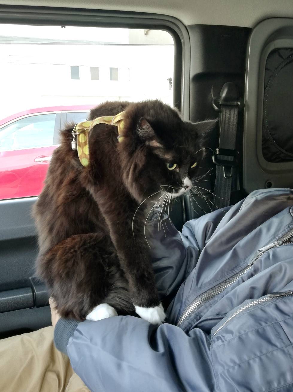 # 3245 (3/29)はい、着いたよ。帰ってきたよ。もう、おうちだよ。駐車場に着いたのに後ろでくつろいで動かないくーちゃん。まるがシートを倒してよっこらしょ、とつれてくる。えっ、くーちゃんそこで落ち着くの?まるが横になってるのはくーちゃんをつかまえるためで、これから寝るんじゃないんだよ。しってるけどー。と、甘えたいくーちゃん。あら そーなの。甘えんぼさんだね。でも、もう帰るよ。リュック入って。リュックに詰め込まれるくーちゃん。マンションに着いてエレベーターに乗り込んだら、にょきっと顔を出すくーちゃん。いつものやつね。早く着かないかなーの、くーちゃん。(ポストに入ってたチラシを持っている)さて、城山公園ではお花見いなりと天むすを買ってきた。五平餅を食べたあとに買い足したのだ。柴漬けの入ったピンクのお稲荷さん。お花見しながら公園で食べたらいいんだろうけど先に五平餅というごはんのかたまりを食べているからさらにこれらを食べると寝ること必至。なので、帰ってからのお昼ごはん。天むす食べるの久しぶり。おいしいし好きだけど、普段あまり買うことがない。そもそも最近おにぎり買わない。外でおにぎり食べるシチュエーションがないし、買ったおにぎりを家で食べるというのも何だかな。今回は、五平餅の米がうまい店だから、これらもきっとおいしいのでは、ということで。そして、おいしかった。めずらしいものは必ず見に来るくーちゃん。めずらしくなくてもテーブルの上はいつも一応チェックするけど。見たけど特に食べたいものはない。えび天も興味なし。くーちゃんは素材そのままが好きなのだ。くーちゃんのごはんないんだけど…!うん、まだ用意してる途中だからちょっと待ってね。くーちゃんのごはんの蒸し鶏もすぐに出しますから。= = = = = = = = = =さてー、今日もまた写真ないので2年前の2歳くーちゃん、おかえり906日目は お休み。代わりにこれでも見ててー。4年前のくーちゃん。 → なでなでされる(動画つき) → テーブルチェック = = = = = = = = = =おっきいくーちゃん。今日は、2008年。2008年4月18日の写真。 → すなぎも (お手軽おやつ) カミカミしているくつした。お皿の外に転がすくつした。際どい位置にある砂肝。お皿もきれいになめるくつした。おいしかった!のくつした。- - - - - - - - - -ランキングサイト参加中 LINEスタンプ Tシャツとか 買ったものと欲しいもの