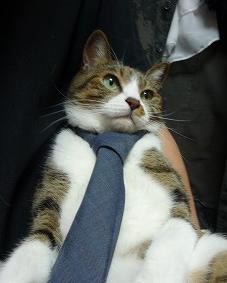 にゃんた、何つけてるの??…ネクタイクローゼット整理をしていた同居人に強要された模様。なかなか似合ってるんじゃない?いつもおっぴろげなにゃんただけど、これなら大丈夫…やっぱり変???