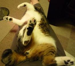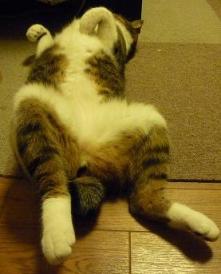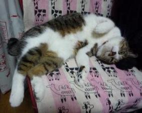 最近のにゃんたの決めポーズはこれ。いつもこうやって寝ています。片耳折れちゃっても気にしない!けしからん肉球です。萌えます。(親ばか)ラジオ体操でこんなポーズあった気がする
