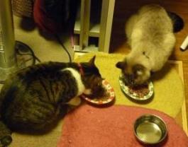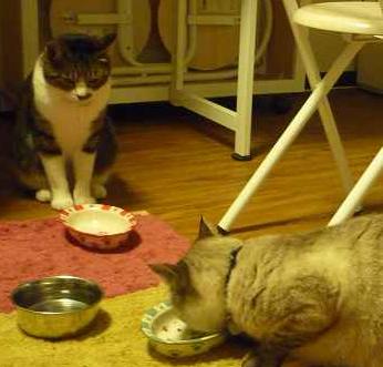 にゃんまめの食事風景。以前はそれぞれの嗜好と持病のため、にゃんたは缶詰、まめたろうはドライフードを食べていましたが最近まめたろうが缶詰に興味を示し始めたので、同じごはんを食べています。 うまうまうまちょっと目を離すと、いつの間にか食器を取り替えていたりします。中身は一緒なのに…にゃんた「それ、おいしそうだね」まめたろう「そっちこそ、おいしそうだね」にゃんた「じゃ、交換しよっか」なんて会話がなされているかどうか知りませんが、中身は一緒ですヒトと一緒で、隣の人が食べてるものはおいしそうに見えるのかしら お水の取り合い。