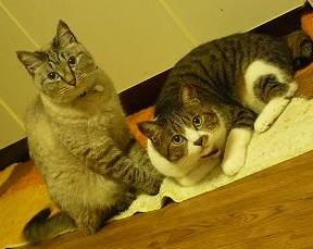 2匹そろって恨みがましい視線を送り、ごはんの催促をする2匹。にゃんたの顔が大福みたいです2日はお休み、3、4日は仕事で5、6日と2連休です。2ヶ月ぶりの連休…3月の頭から連休というものがなかったことに最近気付いた私です。5日は我が家で鍋PARTYの予定ですといっても4~5人くらいの集まりですが。にゃんたが少しでもみんなに慣れてくれるといいけど…