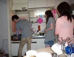 昨日は中止になってしまったバーベキューの代わりに、4人お客様を招いて我が家で鍋パーティーをしました職場の人たちで、3人はまだ学生アルバイトの女の子。1人は男性。まめたろうは女の子大好きですが、男性はちょっと苦手。にゃんたは人見知り無差別級なので、どうなることかとヒヤヒヤしていました。奥の部屋にトイレや水飲み場、おもちゃと一緒に猫たちを隔離して、『猫部屋』にすることも考えましたが大勢の人がいる中、個室に閉じ込めてしまうのも恐怖感をあおるかな?と思い…以前、にゃんたはお客さんにおびえて布団の中に隠れたまま、トイレに行くこともできずお布団の中で粗相をしたこともあるほどなので、少しでも人馴れしてもらおうと、あえて個室は封鎖し、お客様と同じ空間(リビング~ダイニング)にいてもらうことにしました。夕方4時頃、1人目のお客様が(女の子)。にゃんたはあっという間にカーテンの陰に隠れ、出てきませんでした。まめたろうは、最初はびっくりしてにゃんたと一緒に隠れていましたが5分ほどで物陰から出てきて、すり寄って甘えたりしていました。(現金なやつ!)すぐに私とその子で買出しに出かけ、30分ほどで帰ってくるとにゃんたはカーテンの裏にはいませんでした。もうお客さんは帰ったものだと油断して、キャットタワーのてっぺんのハウスでお昼寝しようとしていたらしいにゃんたはこのまま数時間、ここに閉じこもることになります…野菜を切ったりご飯を炊いたり、下ごしらえをしていると、7時前には他の3人も仕事を終えて我が家に到着。この3人のうち1人が男性だったので、まめたろうまで物陰に隠れてしまいました猫たちに会うことを楽しみにしていたお客様たちは、とてもがっかりしていました…が、何はともあれ、鍋パーティー開始です。女子アルバイトよりも精力的に働く最年長の男性社員マメな男性というのは便利素敵なモノですお鍋が出来上がって、乾杯して、お酒も入って話が弾むうち…「手だ!手が出てきた!!」嬉しそうな女の子の声。なんぞ??と思ってキャットタワーの方を見ると…… 「オマエらには片手だけで充分だぜ」…というわけではないでしょうが、ハウスの中で小さくなっていたにゃんたが少しだけリラックスしたのか、のぞき窓からこちらの様子をうかがっていました。お客様がハウスの中に手を入れると、噛み付いたり引っかいたりすることなく、ペロペロと手を舐めてごあいさつ。怖くても威嚇しないにゃんたはよい子です。まめたろうはたまに物陰から出てきてはこちらの様子を見ていましたが、視線はやっぱり男性社員を追っかけている様子…そんなに怖いのかしら??夜も更け、11時を過ぎてから思い出したように片付けを始め、11時半頃にみんな終電を気にしつつ帰って行きました。楽しかったよ、ありがとうみんなを見送り部屋に戻ると、一気に静かになったダイニングににゃんたの姿が。 「も、もういない?もう来ない??」さすがに数時間もハウスの中にいるのは窮屈だった様子。びっくりさせてごめんね、にゃんた…といつもより豪華なごはんをあげた私でしたやっぱりなかなか人見知りは改善されないものですね