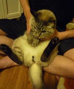 飼い主に爪を立てたので爪切りを強要されるまめたろう。「いや~~~~ん」こういうときは可憐に抵抗します…押さえつける人間にはたくさん爪あとがつきますがにゃんたはどんなときも人に爪を立てるようなことはしませんがまめたろうはエキサイトするとついつい力が入りすぎてしまうようです