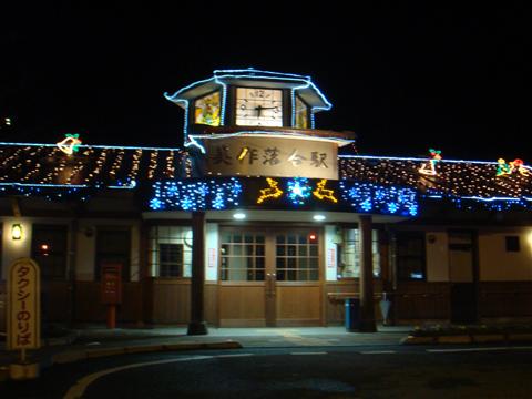 1月2日に撮りました。姫新線の美作落合駅です。違う方向からも。小さい駅です。あまりの綺麗さにちょっと通り過ぎたところをわざわざ戻って撮影。駅の周りが暗いので電飾が際立っていました。ちなみに無人駅ではありませんが駅員さんの居ない時間があるそうです。