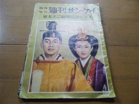 しばらく前ですが、実家を片付けていたら古い雑誌発見。週刊サンケイ、皇太子ご結婚記念グラフ。表紙裏面1ページめくってみた今の天皇が皇太子だった頃のです。1959年(昭和34年)発行。50円。当時の出来事を調べてみると、キューバ革命。在京キー局の放送開始。日本初の高速鉄道、東海道新幹線着工。ハワイがアメリカ50番目の州となる。等々。”昔”ですね~結構保存状態はよさげ。アンティーク的な価値はまだあまりなさそうなので、もう少ししまっておきますか。