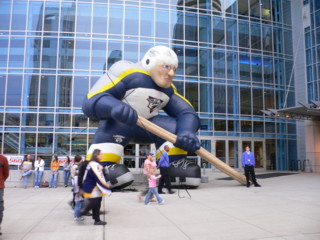 今年もアイスホッケーのシーズンが開幕しました。テネシーはアイスホッケーが盛んで『NASHUVILLE PREDATORS』の本拠地でもあります。週末に初めて試合を観に行ってきました大きなホッケー選手の歓迎・PREDATORSの車に気分もチケットを買って中へ入るとグッズショップでファンの人たちがお買い物。いざ試合観戦へ!野球の試合でもそうですがアメリカは演出が派手で見ていて楽しい応援も派手で、みんなで地元のチームを応援。相手選手が転ぶとすごくブーイングされて気の毒なくらい。電光掲示板には『MAKE NOISE』 『FANG FINGER』など応援指示が出て、その度にみんなで大盛り上がり!FANG FINGERはの2本指を丸めて、牙にみたてて、相手を威嚇します。点が入るたびにテーマ曲が流れてみんなで大合唱!野球もアイスホッケーもアメリカの試合は楽しいですね。