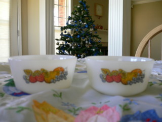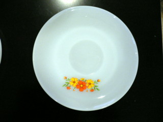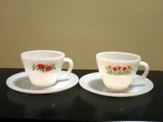 最近よく行くクラフト&アンティークのお店。何回か通う間に気になっていた食器をある日手にとって見た。ちょっとかわいい。と思いながら何気なく裏返してみたらファイヤーキングと書いてある。な~んか聞いた事あるなぁ。。確かマグカップが人気よね。と思いつつ、その日は帰宅マーチのお散歩etc.ひと段落したあとで調べてみたら・・・まったく同じものを見つけてびっくりまるでTV『なんでも鑑定団』な気分。結局、次の日気になって買ってきてしまいました。3客セット+お皿3枚でした。しばらく悩んだ理由のひとつにセット足らずだったのがありましたがお皿が割れても予備があると思う事にしました。他にもフルーツ柄を見つけてきました。買った直後は少し悩みましたが、家に帰って、きれいに洗ってみると大満足。こういうのを『掘り出し物』っていうのかな?お値段は・・・・ないしょ。とってもお買い得でした。