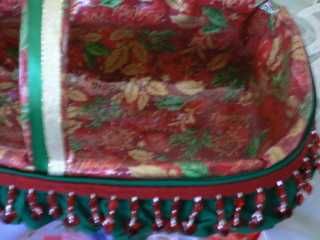 相変わらず、テネシーは寒いです。すっかり冬眠・冬篭り状態です。そこで何年に一度来るか、こないかの手芸ブームがやって来ました。これはバスケットに自分でデコレーションするクラフトです。外側は網目にそってリボンを通します。内側は選んだ布地をアイロンシートでビニールコーティングしたものを貼ります。前に作ったクリスマスオーナメント、母がとても気に入ったので今度のクリスマスに向けて増産中です。