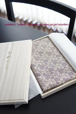 わ、私・・・この年になるまで自分の『ふくさ』を持ってませんでした(苦笑)(親のを借りたりしてました^^;)あ・・・あはっ・・・(汗)って、ごまかせない歳ですし(笑)、さすがに持ってないとダメだろうと、来週ある従兄弟の結婚式に向けて購入しました~♪岩田屋(福岡ではメジャーな百貨店)で、上品な色と柄に一目惚れ^m^店員さんにお聞きしたところ、冠婚葬祭どちらもOKとのことでコレに決定!(簡易ふくさです^^)牡丹唐草模様で絹100%なので桐の箱に入ってます^^;少しふっくらとした造りになってるので、水引の飾りが出っ張っていても、浮いたりせずしまります。(お祝い袋が地味ですか??笑)ちょっと高価かなーって思ったけど、きっと永く使うものだし、夫も仕事関係で使う機会が多くなると思うので。。。大事に使っていきたいです。読んだよー!の印に、ポチ☆よろしくお願いします^^にほんブログ村★楽天さんでも取り扱い店ありました。