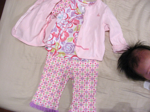 本日2回目。昼過ぎに親戚のおばさんが来て愛想を振りまくっていたムスメちゃん今日あたりから急に大きな声で「あ~~う♪. (*^-^)ニコ.」なんて言うようになってますます可愛くなってきましたそんな大きな声が出るなんてママちゃんびっくりよ~!本日娘ちゃんお風呂あがりコーデ♪でもコレ上下が完璧に分かれているので抱っこをするとズリ上がってきて背中が丸見えになってしまう。。寒そうでチトかわいそう。。ちなみに3~4ヶ月ぐらいのお子様は日中来ている服と、パジャマとで区別つけているのかな。うちはまだ寝返りもうたないし、基本ねんねの体勢なので着替えはお風呂上がりの1回のみなのです。もう少ししてもっとゴロゴロ動くようになったら朝起きたら着替えさせて、でも良いかなと思っているのだけど。ところで最近の娘ちゃんの夜のタイムスケジュール19:30 お風呂20:00 おっぱい&ミルク(100~120ml)20:30 寝かしつけ大体こんな感じなんだけど、寝かしつけ開始から寝るまでがメチャ長い。。今日も1時間ぐらい格闘して眠りについたと思いきやベッドに置くと泣き出したり。。疲れたので旦那ちゃんにバトンタッチして、そこから義母のもとに渡り、、そして先程ようやく眠りにつきました。。ココのところずっとこんな感じで寝かしつけには苦労してるなぁ。けど眠りについたら朝まで目覚めないことが多いからその点、楽なのかも