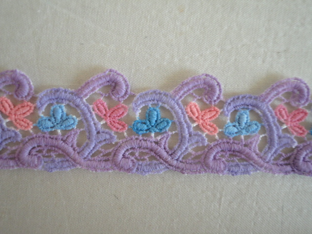 アラベスクっぽい模様に合わせて、ステンシル用のシートを切りました。今日は絵の具「パープル」に白をまぜて薄紫を塗ったのですが・・。4時間近くかかった!すごく丁寧に塗っているつもりもないのですが、6メートル近くのレースなので時間かかります。普段ステンシルをやり慣れているワケでもないし、得意じゃないんです~~。ちゃんとステンシルをご趣味になさっている方から見たら稚拙だと思いますが、載せますね。私は普段そんなに肩コリはしないほうなんですが、さすがに肩と背中がバリバリにコリました。もう今日はこれ以上は無理(^^; あと1色はもう少し赤みを入れた薄紫を塗る予定です。足りなくなると同じ色が作れなくなりそうなので、多めに色を作っておきます。乾いてしまうと絵の具が使えなくなるので、一気に塗らなくてはイケナイ。時々水を足して混ぜて、乾燥させないようにしなくては。そして一番大事なのは、「続けて4時間」を確保できる時にやらなくてはならないということ。土日は無理っぽいな~。家族がコマゴマと出入りするから。私がアリスのワンピとエプロンに使ったこのレースについて、コメントで質問なさった方がいらっしゃいましたよね。昨日ユザワヤさんでレースをチェックした時に同じレースを見つけました。私が買ったのは、数メートルでワンパックになっているワゴンセール品だったのですが、巻きで売られていました。あ、お値段チェックし忘れました!ごめんなさい。私がそのパックものを買ったのは多分10年位前で、今だに同じ商品があるということはこれは定番モノなんでしょうね。意外とアリス服に向いていますので、お作りになるご予定の方はチェックしてくださいね♪え~ん。肩イタイよぉ・・。