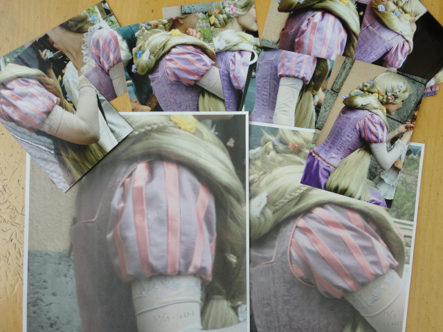 作り始めました。まずはグリーティングのラプンツェルの「袖」研究(^^)撮った写真の中で、袖のストライプがちゃんと正面から撮れているものを探して、A4サイズ位にプリントアウトしました。ピンク部分の幅とパープル部分の幅を測ります。ピンクの寸法とパープルの寸法が、どの位の割合になっているかを計算します。2枚のプリントで平均すると、大体ピンクがパープルの64%くらいだったので、それを元に作る袖のピンクとパープルの幅を計算し、配置を見ながら幅を決めます。ラプンツェルの袖のストライプは、多分ピンクが9本です。撮った写真を全部チェックしたのですが、ビスチェの肩のはぎ合わせあたりから出ているものを「センターの1本」として、それより前に4本、それより後ろに4本あるようでした。現場で数えたワケではないので、もしかしたら間違っているかもしれません。どうしても同じにしたい方はご自分でご確認くださいね。ラプさんのパフスリーブの袖口、ナニでギャザーを寄せているのか分からない。ゴムを入れているように見えないんだけど・・。私は裏地を付けることにしました。表裏2枚を袖口で縫い合わせて表に返し、表布と裏布の間にゴムを入れる方法です。mixiアルバム「パフスリーブの作り方」と同じやり方ですが、袖口のゴム入れ部分をミシンをかけずに星止めで作りました。ラプさんのパフスリーブの下に出ている、半透明のフィットした長袖は別に作ってあとから手縫いで付けるつもりです。こんなのパフスリーブにミシンで縫い付ける自信ない(^^;伸びる生地は苦手なんですってば。