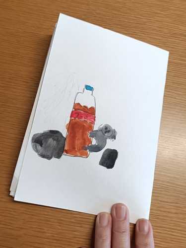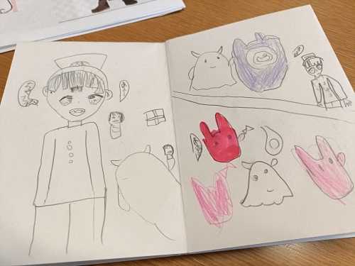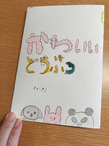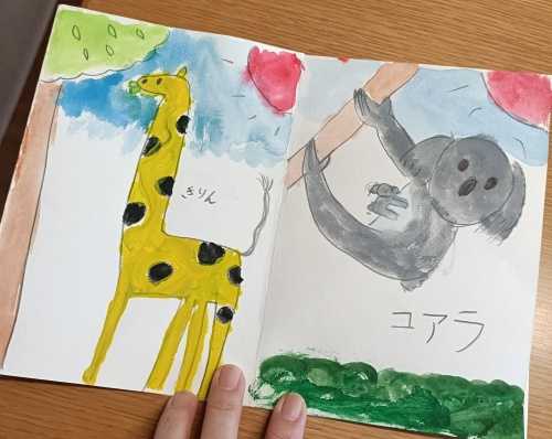 真っ白な冊子に自分なりの絵本を描きます。といってもなかなかお話が浮かばない人は、図鑑でもよいでしょう。絵とそれに添える言葉を考えます。
