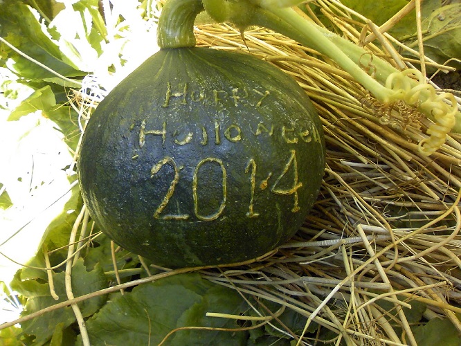 ハッピー ハロウイン かぼちゃの種から育ちました(^-^)ベランダ栽培でも大丈夫ですよ 生育途中で皮に文字を書くと( 皮に傷を付けます )成長しながら、だんだんと文字が浮き出てきますよ