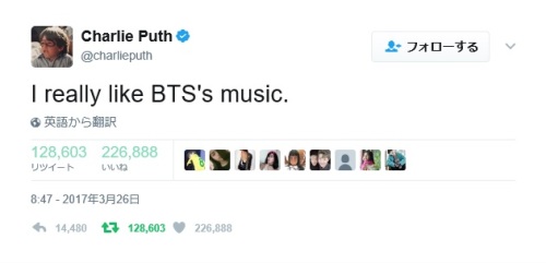 元々洋楽(ロック、パンク、ブラックミュージックなど。ラテンやジャズも)聴きだったが(さらに幼い時はクラシック)K-Pop中心になって洋楽はおろそかに...д・)そんなところ、防弾少年団 방탄소년단 BTSの音楽がいいね!とSNSに書き込んだ チャーリー・プース を知り、バンタンつながりで聴いてみたら...ウィズ・カリファ Wiz Khalifa と「See You Again」で共演しているし、なかなか聴きやすい音だった(尖っていなくて、ある意味、白人っぽい音楽)。返歌、返礼。メーガン・トレイナー Meghan Trainor とコラボした「マーヴィン・ゲ イ Marvin Gaye(featuring Meghan Trainor)」はMV含めレトロな響きの安定感。(MVは韓国だったら19禁になりそう...)セレーナ・ゴメスをフィーチャーした「We Don't Talk Anymore (featuring Selena Gomez)」は切ないラブソング、ちょっとリピしたくなる... Far East Movement x Marshmello Freal Luv ft. Chanyeol & Tinasheくらい元気な曲の方が好きだけど... Back to 洋楽、洋楽発見!IUの1年半ぶりの新曲 IU 아이유 Through the Night 밤편지は恋人に蛍を送るなど...韓国の数多くの映画やドラマでふたりを結びつけたホタルが別れの挨拶代わり、最後のラブレター、夜の手紙のように送られる。せつない...白磁の大壷がすてき。to be continued...!?buzz KOREAClick...にほんブログ村 韓国映画にほんブログ村 映画にほんブログ村 映画評論・レビューにほんブログ村 韓国情報にほんブログ村 K-POPにほんブログ村Copyright 2003-2024 Dalnara, confuoco. All rights reserved.本ブログ、サイトの全部或いは一部を引用、言及する際は著作権法に基づき出典(ブログ名とURL)を明記してください。無断で本ブログ、サイトの全部あるいは一部、表現や情報、意見、解釈、考察ロジックや発想(アイデア)・視点(着眼点)、写真・画像等もコピー・利用・流用することは禁止します。剽窃厳禁。悪質なキュレーション Curation 型剽窃、つまみ食い剽窃もお断り。複製のみならず、切り刻んで翻案等も著作権侵害です。