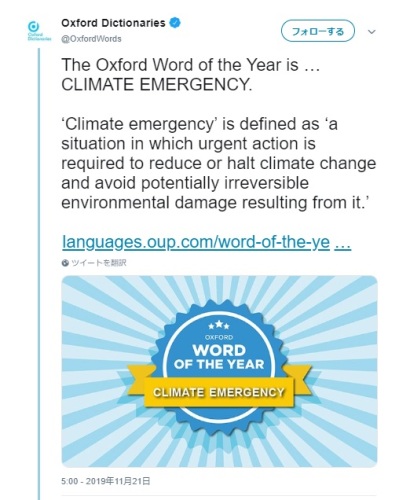 オックスフォード辞典のワード・オブ・ザ・イヤー(今年の単語)は㌦㌦㌦㌦㌦...The Oxford Word of the Year is … CLIMATE EMERGENCYグレタ・トゥーンベリ Greta Thunberg さんが世界中の若者を動かした熱意が伝わったかのよう。9月の気候マーチ参加者数は、ヨーロッパでイタリア150万人、ドイツ140万人、英国35万人、フランス19万5,000人、オーストリア15万人、スウェーデン7万人、アイルランド5万人などアメリカ大陸はカナダ80万人、米国50万人、チリ10万人以上ブラジル2万人、ペルー1万5,000人、メキシコ1万3,000人などオセアニア オーストラリア35万人、ニュージーランド17万人、太平洋地域3千人アジアはインド1万3千人、パキスタン1万人、韓国日本で各5千人など世界中で多数の若者や市民が参加。オックスフォードの解説によるとCLIMATEとEMERGENCYの組み合わせはこれまでにない組み合わせ、用法とのこと。EMERGENCYの従来の用法では健康関連の、パーソナルなワードとセットというパターンだったが今年は気候変動問題がクローズアップされたため、CLIMATEと組み合わせた用法が急増したそう。私もグテーレス国連総長の呼びかけに応えて国連総会でアマゾン熱帯雨林火災について解決してほしい、と聞いてみた。今年はアマゾン熱帯雨林の火災にもオーストラリアの山火事にも多くの野生動物が巻き込まれて死んでしまい胸が痛くつらい。人間が環境を破壊し続けると野生の動物や植物まで巻き込むことになるのかと思うと...(;_;)to be continued...!?buzz KOREAClick...にほんブログ村 韓国映画にほんブログ村 映画にほんブログ村 映画評論・レビューにほんブログ村 韓国情報にほんブログ村 K-POPにほんブログ村Copyright 2003-2025 Dalnara, confuoco. All rights reserved.本ブログ、サイトの全部或いは一部を引用、言及する際は著作権法に基づき出典(ブログ名とURL)を明記してください。無断で本ブログ、サイトの全部あるいは一部、表現や情報、意見、解釈、考察、解説ロジックや発想(アイデア)・視点(着眼点)、写真・画像等もコピー・利用・流用・盗用することは禁止します。剽窃厳禁。悪質なキュレーション Curation 型剽窃、つまみ食い剽窃もお断り。複製のみならず、ベース下敷きにし、語尾や文体などを変えた剽窃、リライト、切り刻んで翻案等も著作権侵害です。