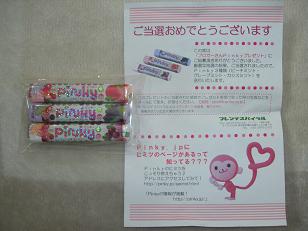 ポストにフレンテスパイラルから郵便が届いていました。早速開けてみると、中にはピンキーが3つ入っていました。応募したことも忘れていましたが、うれしいです(v^ー°)たぶんすごい人数、当たったんでしょうが、家族に自慢しちゃいました。ピーチミント・グレープミント・カシスミント味の3種類でしたよ♪ピンキーは普通丸い形をしていますが、中にハートの形のものが時々入っています!これをみつけるとなんだかうれしくなっちゃうんです(*^ワ^*) 今回もハート型、みつけました(カシスミントの中で)!!でもピーチミントって全部ハートの形なのね・・・。ほとんど娘とだんなさんに食べられちゃいました~。また何か当たらないかな~。★コーヒー1年分(カフェバック360袋)プレゼント!!★