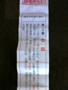 昨日のバス遠足で、娘がおみくじを作っているところに行きました。みんなでおみくじを引いたらしいのですが、娘は「中吉」だったそうです。他の子は大吉の子もいたらしく、やっぱりうちの娘の運はそれぐらいよね~。なぜか凶はなかったみたい・・・小学生だから凶は入れなかったのかな(^―^)「凶」って引いたことないんですよね~。大吉ならあるんですが・・・「大凶」を引いたらすごくいいっていいますよね。誰か引いたことのある人いますか~?なぜか字が大きいです。小学生用?