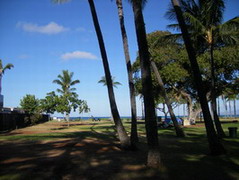 【2010年4月26日(月)・三日目】10本目の小道で海に引き寄せられてしまったので、ちょっと間があいてしまったラニカイ小道散策。ラニカイビーチをしっかり堪能し、また10本目の小道からバス通りに出ます。そして少し進むと、あっさり見つかった11本目の小道。行き着いた先には、子連れのママが二組(+わんこ)。そして、岩場で宿題(?)をしている女の子を発見。わんこも気持ちよさそうだね~。そして何気ないのに絵になる女の子。私だったらボーっとしちゃって勉強ははかどらないかも(笑)赤ちゃんがおむつのまま海辺をハイハイしてて、これまた癒される~。う~ん、もういちいち絵になるラニカイビーチ。12本目の小道があるかどうか探索する気にもならず(笑)そろそろ移動開始。ここからまた歩いて、次はカイルアビーチパークを目指します。