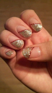前回と同じサロンにて、お得なクーポン利用。今回も斜めフレンチのデザインに。今まで出一番、派手な仕上がり!色選びに迷いすぎてこうなってしまったけれど、まぁ、クリスマス&お正月っぽいってことでよしとするかな。先端はシャンパンゴールドとオーロラシルバーの2色のラメを混ぜたもの。こんなにキラキラ・ギラギラしてしまうとは(苦笑)ラインは、朱に近い赤のラメ。派手だけど、爪がキレイだと気分上々♪大掃除の時に手袋はめなきゃね!