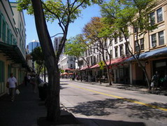 【2010年4月25日(日)・二日目】駆け足で出雲大社の参拝をすまし、次はアラモアナショッピングセンターへ移動。出雲大社の事務員の女性にバス停の場所を聞く事が出来てよかった。事前に調べてはいたけれど、バス停があるからといってお目当ての路線が通ってるとは限らないし、ワンウェイだったりするんですよね。日本と違って、必ずしも降りたバス停の向かい側に同じ路線の反対方向のバス停があるわけじゃないし。「Hotel St.」という通りがバス専用道路だと教えてもらいました。チャイナタウンのど真ん中あたりなのかな。観光客もほとんどいなかったと思う。この瞬間、日本人は私一人だったと言い切れるな。個人商店の目の前にあるバス停で沢山の人がバスを待っています。狭い歩道に人が列を作ってました。臭いも独特だったなー。ハワイにいるとは思えない雰囲気。お目当てのバスが来るまで25分くらい待ったかな。バスに乗り込んで、アラモアナショッピングセンターへ向かいます。