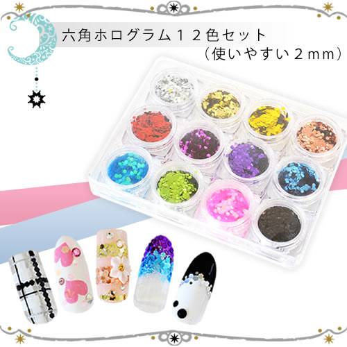 特徴 ネイルアートに大活躍!可愛い12個コンパクトケースに収納された六角ホログラム(2mm)、12色セットです。 セット購入だからとってもお得! 内容量 直径3cm × 高さ1.5cm のケースにおおよそ7分目程度 カラー メタルカラー12色(画像参照※一部メタルカラーではないものも含まれています)・・・