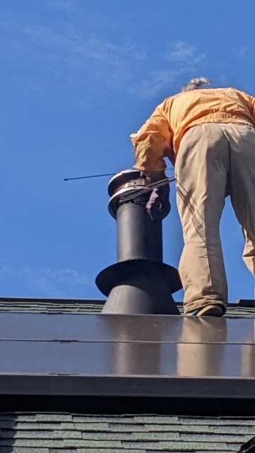 煙突掃除は今年で終わりと言いながら足をカクカクさせて屋根に登っています 。