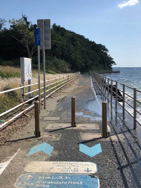 また、ここの写真のように車道から歩道に移ったり、前触れなく脇道に入ったりするので事前にコースを調べて、スマホに公開されているPDFデータを保存しておくことをお勧めします。