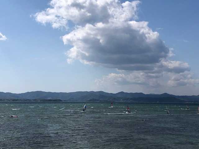 めっちゃ風が吹いてるのでチャリにはきついですが、ウィンドサーフィンをやる人たちには絶好のコンディションのようです。かなりの速度で走ってました。
