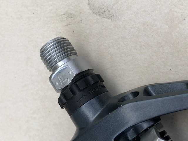 特に左側については、ペダリング中に緩んでしまわないようにするため「逆ネジ」になっていますが、これもペダル側にきちんと締め付け方向が刻印されています。(黒い部分に「←TIGHTEN(こっちに締めろや)」とあります)