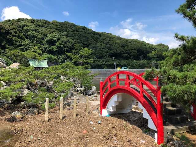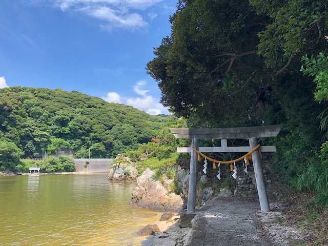 橋のすぐ横からほっそい参道があるので、そこを通って猪鼻湖に突き出た神社に向かいます。