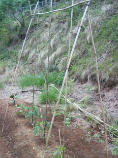 今年の気候はちょっと変です。雨が多いし、晴れても風が強い日が多い。ラニーニャ現象のせいでしょうか?牧場の菜園は、風の通る場所にある為、心配です・・・と思っていた矢先、トマトの苗が強風で折れてしまいました。急遽、「手」を作り、固定。発見が早かったので、ダメージも少なく、また成長し始めました。こんな、変な天気の中でも、元気に育っています。トマトの花が咲きました。キュウリの赤ちゃんが出来ました。枝豆くんです。トウキビはまだまだ小さいです。これから、気候が良くなると、一気に成長するかな?楽しみ・・・。