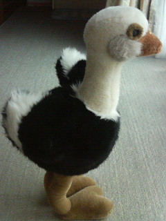 本日、某ネットオークションで落札した商品が届きました。その商品とは・・・ダチョウのぬいぐるみ・・・。以前からダチョウのぬいぐるみを探していたのですが、なかなか無いんです。たまにあっても、ダチョウの特徴である足の指が3本だったり・・・。しかし、これは・・・ちゃんと、2本です。しかも、自立します。お尻も、結構キュート!以外とデカイ(40cm位)です。今度は、ヒナがほしいなぁ・・・。