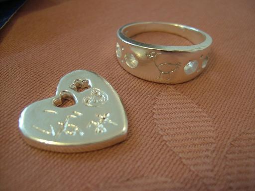 連休を利用して、伊豆高原のペンションに泊まりました。伊豆高原は日本でも有数のペンション密集地帯です。数あるペンションの中で、一軒のペンションを選びました。選んだ理由は、「子供大歓迎!」というのと、「食後の銀細工体験」。そこで、娘と二人で、初めての銀細工に挑戦しました。娘は、ペンダントトップで私が指輪に挑戦!夕食後、8時30分、作業開始!優しいオーナーさんの指導のもと、銀細工に没頭・・・・。デザインは、もちろん・・・・「アレ」です。娘は、約2時間半かかって、可愛いハート形のペンダントトップを作り上げました。そのころ、私は、まだ、リングの形成中・・・。その後、結局、焼き上げる機械に入れたのが、12時まわっていました。一年のうちでも最も忙しい、ゴールデンウイーク中に、深夜まで指導をしていただいたオーナーさん、ありがとう御座いました。そして、次の日・・・。出来上がった作品をみて、超感激!壁画風ダチョウとタマゴをデザインしてみました。想像以上に上手に出来ました。これまた、陶芸と同様にハマッてしまいそうです。