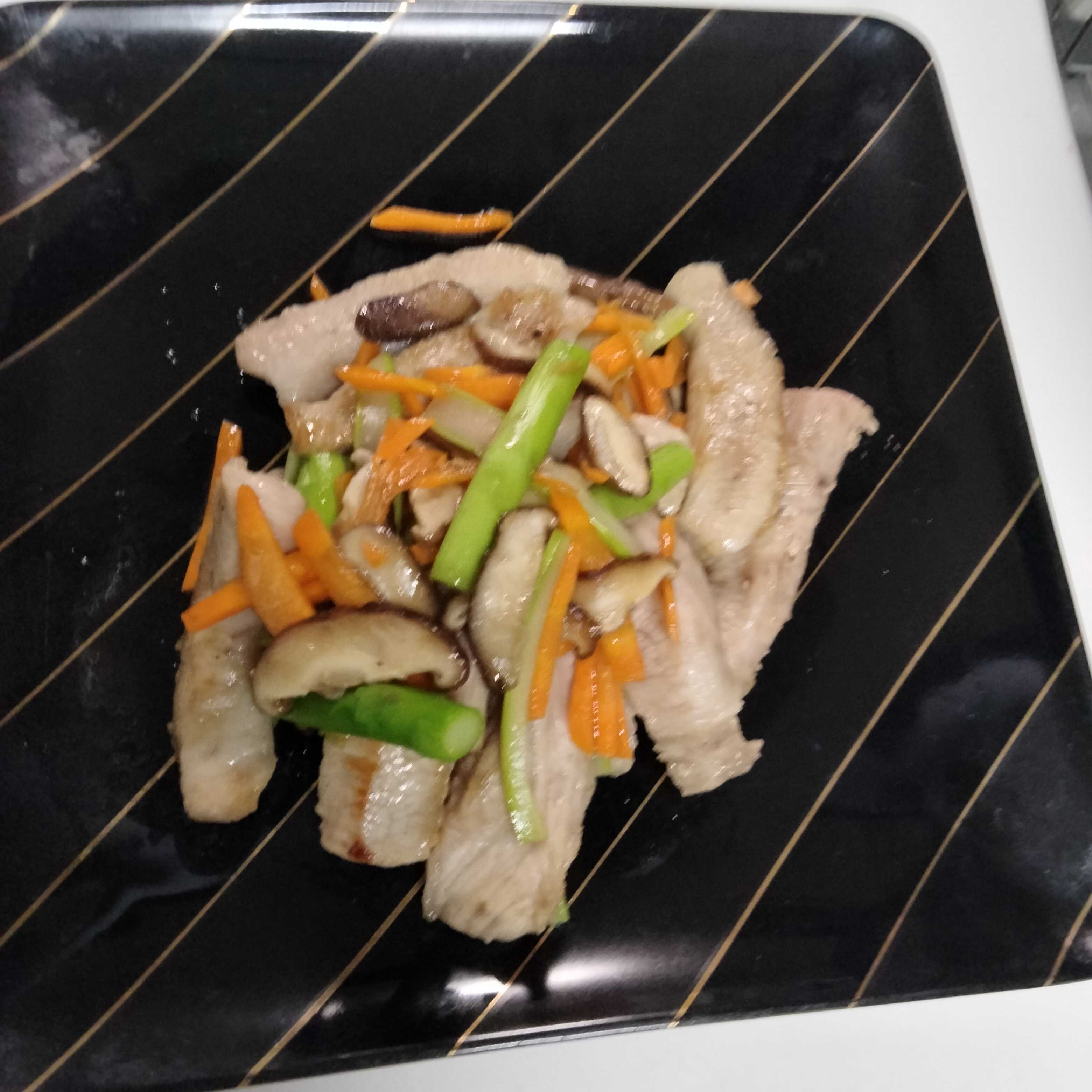 野菜はアスパラは先に茹でてにんじんとしいたけは細切りにしておくトントロを炒め野菜は後で入れる味付けは塩麹レモンをかける