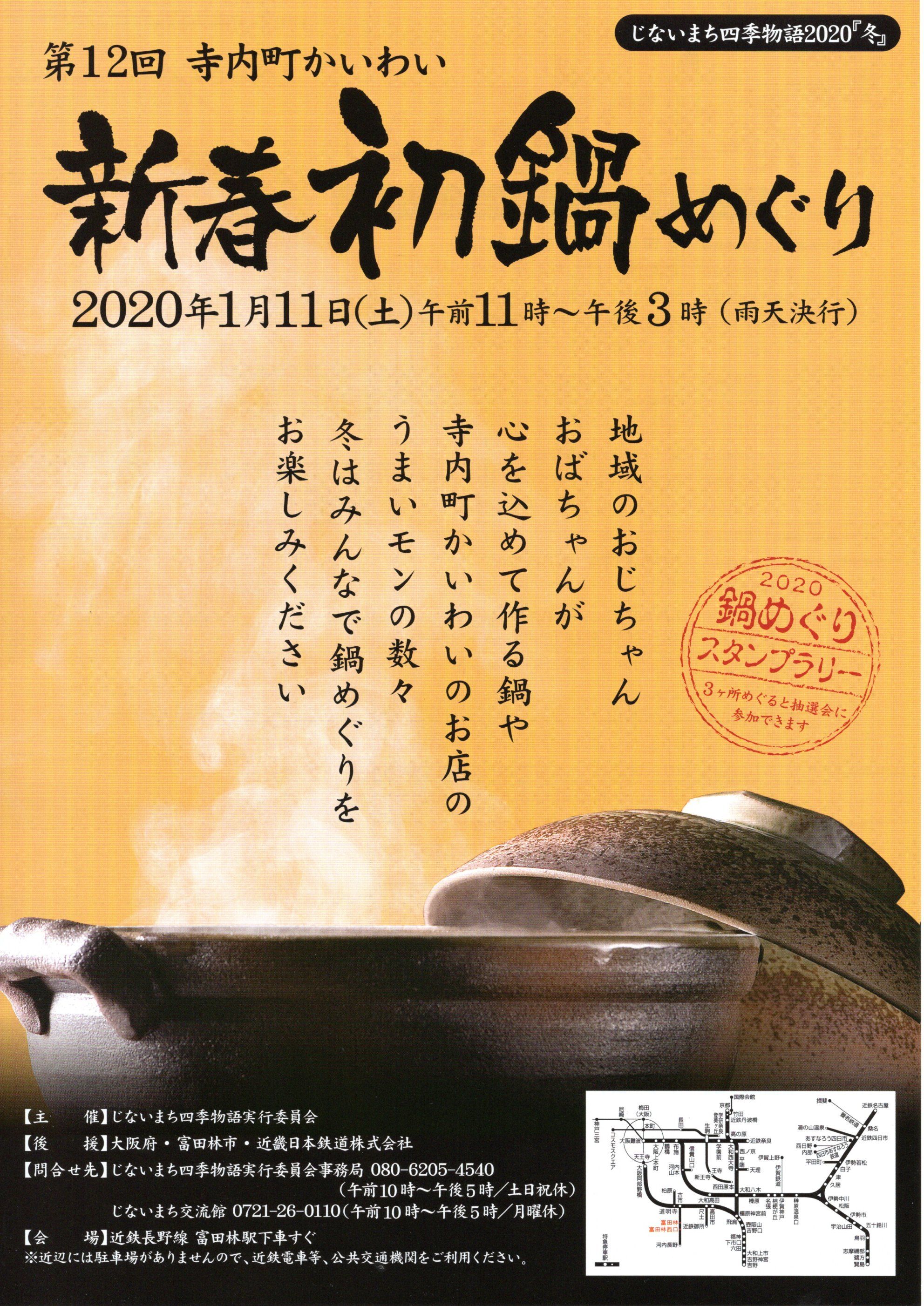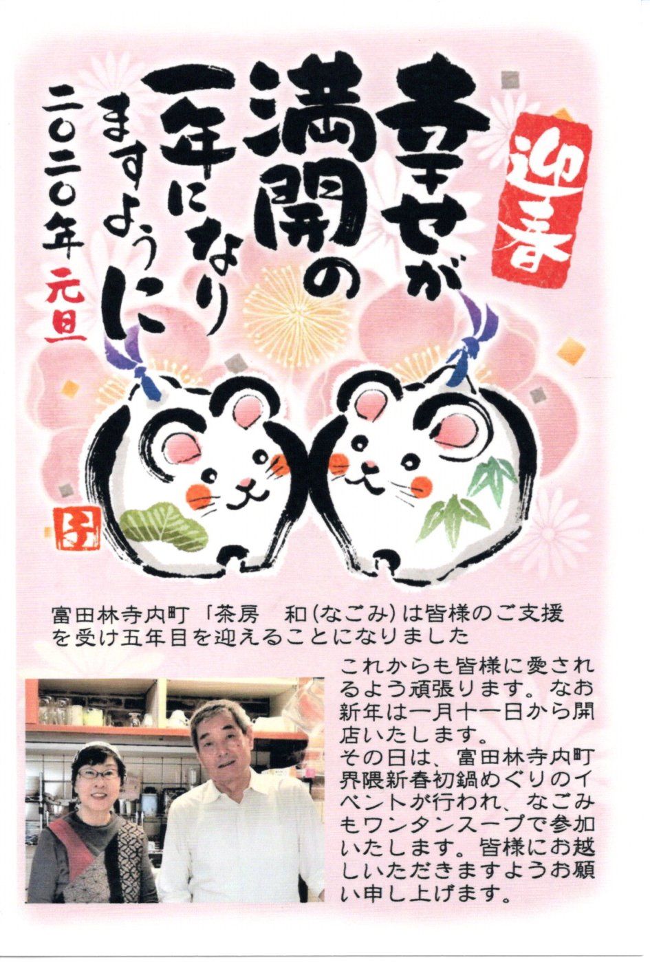 新年あけましておめでとうございます。・・・・昨年は皆様方に大変お世話になりました。おかげさまにて素晴らしい一年でした。この場をお借りして厚く御礼申し上げます。ありがとうございました。 今年は昨年の振り返りと反省を込めて、また、私ども夫婦の生き方として「ゆっくり」「あわてることなく」「手を取り合って」「お互いに助け合い」「欲を張ることなく」なお一層「健康に留意」しながら、生きていきたいと思います。どうか皆様のご支援を賜りますようお願い申し上げます。 富田林寺内町「茶房 和(なごみ)」は、1月11日(土)より営業をいたします。今年も、土曜日・日曜日・祝祭日のみの開店です。1月11日(土)は、富田林じないまち界隈「新春初鍋めぐり」というイベントが開かれます。「なごみ」も、手作りの「ワンタン入りスープ」で参加いたします。100食のみの限定販売となりますので、お早めにお越しくださいね~・・・お待ちいたしております。