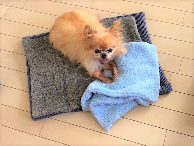 ★ 出来上がったのはあたしの『マット』? ★***鈴ちゃんのコメントです***あのね・・・今日はママがお家にずっといてミシンで“縫い縫い”していて・・・出来上がったのはあたしの『マット』?きもちイイね~~~♪ママ:『それは鈴ちゃんのじゃないのよ』鈴ちゃん:『エッ!?あたしのじゃないの?』ママ:『じゃあ、鈴ちゃんにあげる』鈴ちゃん:『ワ~~~イ!』気持ちイイ~~~♪★ 夕食は『生ハムピザ』 ★トッピングは・・・今日は朝からイイお天気で暖かいのを通り越して暑いわ(汗)こんな日は、お洗濯三昧~~~冬物の洋服・・・毛布・・・鈴ちゃんのベッド・・・などなど、いっぱいお洗濯しましたお洗濯と言っても、『洗濯機』がやってくれるワケで洗濯をしている間にミシンを出して・・・古いバスタオルで足ふきを作っていたら↑のように鈴ちゃんに取られちゃった・・・(笑)夕食はお買い物に行くのも面倒だし旦那君も居ないので、冷蔵庫の整理がてら恒例(週1で食べている)の『生ハムピザ』よチルドの『ピザ』をクッキングシートを敷いた鉄板に置いて・・・今回は使うのは「チーズピザ」なので「ピザソース」かけて・・・トッピングは「玉ねぎ」「ピーマン」「プチトマト」本当は「ピザ用チーズ」なんだけど無かったので「モッツァレラチーズ」で代用こんな感じでトッピングして・・・オーブンで“焼き焼き~~~”焼きあがったら「生ハム」をトッピングして出来上がり~~~♪*****************ブログランキングに参加中です よろしかったら↓を“ポチッ!”してね♪ ☆★☆琴&鈴ちゃんニット☆★☆☆★☆ 旅行日記 ☆★☆☆★☆ お散歩日記 ☆★☆