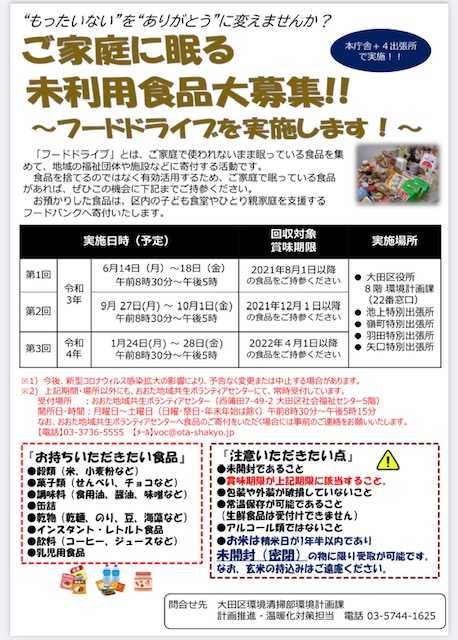 ★ 【フードドライブ】に参加しました ★夕食は<フードロス削減ディナー>(画像付きレシピあり)以前から話題になっている【フードドライブ】に参加しました(区のHPより)家で余っている食品を持って区の出張所へ”GO!”前回参加した時は、はじめてだったので余っている食品がミカン箱1杯ありました↑のチラシを見てフードロスにならないように買い置きを控えたり・・・食材を無駄にならないように使ったり・・・それでもレジ袋1袋ありました集まった食品は『フードバンク』や『子ども食堂』に寄付されますキャロトモの住んでいる区だけじゃなくてたくさんの区や市でやっているようですこういう活動が広まるとイイね家に帰ってきてフードロス削減の為さっそくストックしてある食品だけで夕食作り残っていた「さつまいも」を揚げて以前買ってあった「大学芋のたれ」で和えて「黒ごま」をふって『大学芋』冷凍してあった「鳥むね肉」と「ブロッコリーの芯」を茹でて「マヨネーズ」&「粒マスタード」で和えて『マスタードマヨチキン』冷凍の「きざみうなぎ」と「玉子」で『う巻き』賞味期限間近(明日まで)の「ウインナー」と野菜室で埋もれていた「ピーマン」を炒めて味付けして『ウインナーピーマン炒め』後のお料理も冷蔵庫にあった食材で作って昨日の残りも盛り直して<フードロス削減ディナー>の出来上がり~~~♪家にあった物だけでこれだけのお料理ができるのね旦那君も美味しいって食べてくれてよかったわ特にお気に入りだったのは『マスタードマヨチキン』と『大学芋』でしたしばらくフードロス削減のメニューが続きそうです***********ブログランキングに参加中です よろしかったら↓を“ポチッ!”してね♪☆★☆琴&鈴ちゃんニット☆★☆☆★☆ 旅行日記 ☆★☆☆★☆ お散歩日記 ☆★☆