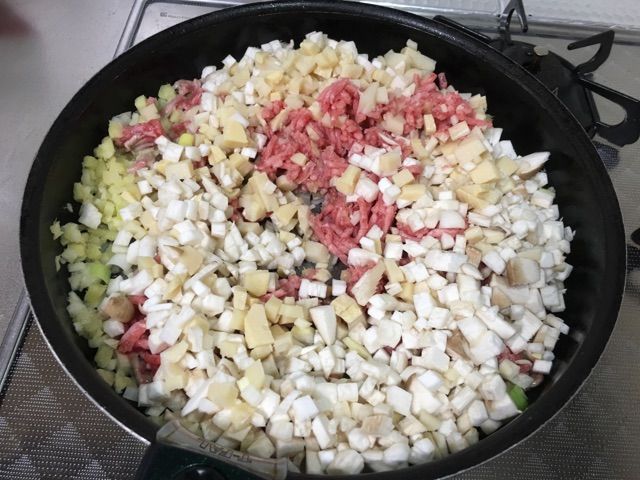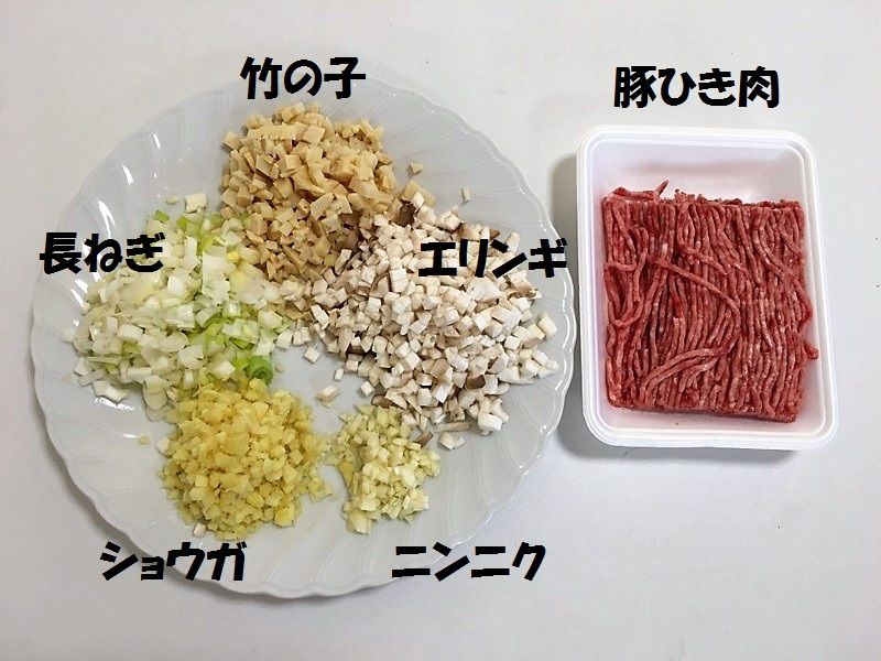材料: 豚ひき肉 ショウガ・ニンニク エリンギ(しいたけでも可) 竹の子・長ねぎ ↑はみじん切りにする |